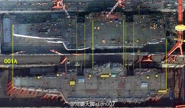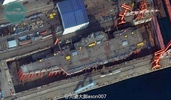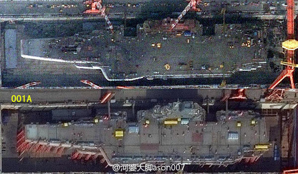 日前,網(wǎng)上傳出中國(guó)國(guó)產(chǎn)001A航母近期衛(wèi)星照,顯示該航母已經(jīng)建成,輪廓分明。(鳴謝:網(wǎng)友河婆大腳ason007)