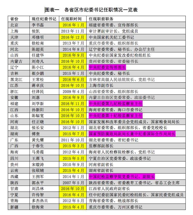 由此可見,2015年3月以來新任的19名省級(jí)紀(jì)委書記(圖表一中標(biāo)注黃色者),都是按照《省(自治區(qū)、直轄市)紀(jì)委書記、副書記提名考察辦法(試行)》的要求選任的,提名以中央紀(jì)委會(huì)同中央組織部為主,既可以從紀(jì)檢監(jiān)察系統(tǒng)內(nèi)部也可以在系統(tǒng)外產(chǎn)生提名人選。在19人中,鄧修明、任建華、陳小江、劉惠、劉學(xué)新、陳輻寬、傅奎、于春生、許傳智等9人曾有過紀(jì)檢監(jiān)察機(jī)關(guān)任職履歷;而其余10人則從無紀(jì)檢監(jiān)察崗位任職經(jīng)歷,為系統(tǒng)外提名產(chǎn)生,兩者的比例恰好大致各占了一半。從人選任現(xiàn)職前的職務(wù)來看,符合《提名考察辦法》規(guī)定的要求,全部為交流任職。