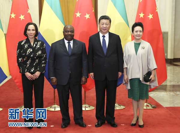 12月7日,國家主席習近平在北京人民大會堂同加蓬總統邦戈舉行會談。會談前,習近平在人民大會堂北大廳為邦戈舉行歡迎儀式。這是習近平和夫人彭麗媛同邦戈總統夫婦合影。新華社記者龐興雷攝