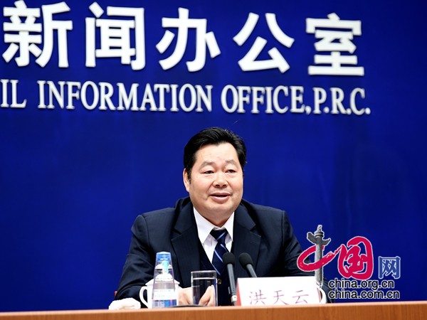 圖為國務(wù)院扶貧辦副主任洪天云。(來源:中國網(wǎng) 攝影:宗超)
