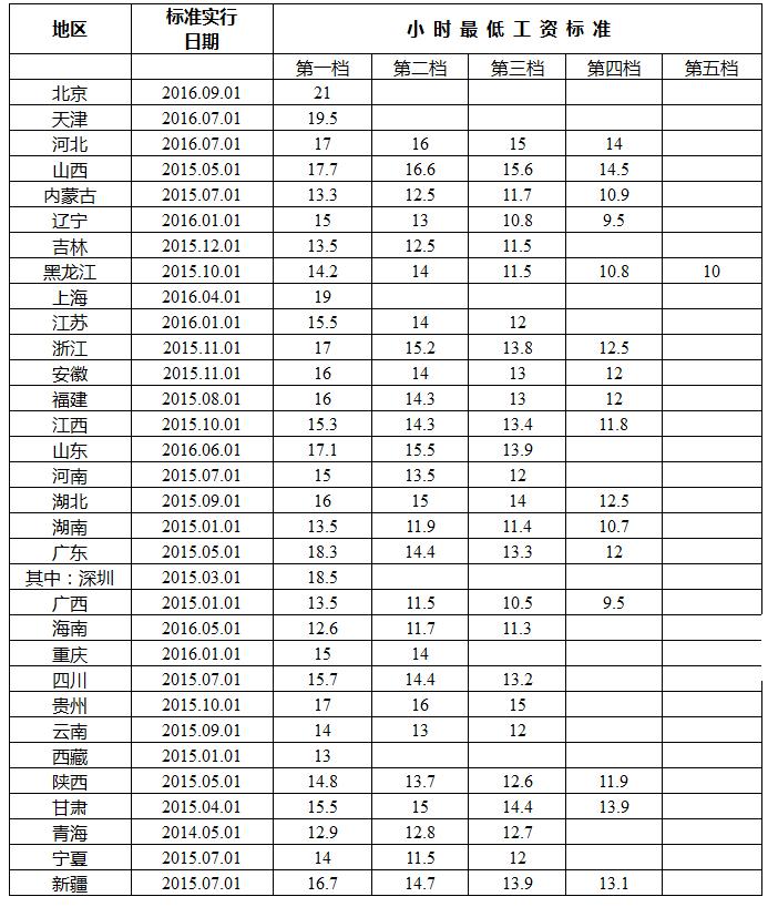 第一檔小時最低工資標準,北京最高,為21元。天津(19.5元)與上海(19元)分列第二、三位。