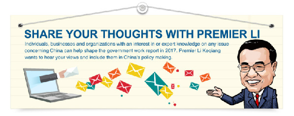 這是中國政府網(wǎng)第三年開展網(wǎng)民建言征集活動(dòng)。2016年,《政府工作報(bào)告》有93處部署具體工作的表述與網(wǎng)民建議高度契合;在“兩會”總理記者會上,李克強(qiáng)總理回應(yīng)了網(wǎng)民留言關(guān)切的全國醫(yī)保聯(lián)網(wǎng)問題。教育部、人力資源社會保障部、稅務(wù)總局等多個(gè)部門辦理并解答了網(wǎng)民給總理的留言。