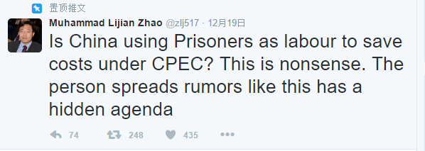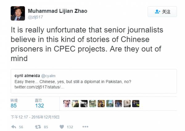 “中國外交官反擊對中巴經濟走廊的批評”,據巴基斯坦《黎明報》和印度電視臺等20日報道,針對巴基斯坦一些人無端指責中巴經濟走廊項目“存在腐敗、不均等、不透明、使用中國囚犯”等,中國駐巴基斯坦大使館臨時代辦趙立堅近日與《黎明報》記者在推特上展開“公開論戰”。趙立堅稱,中巴經濟走廊得到了大多數巴基斯坦民眾的認可,運作良好,但一些人出于不可告人的目的,傳播虛假消息。