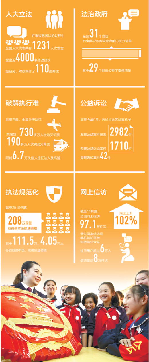 2016年,一共有35部法律獲得通過,其中修改25部,新制定10部。人民群眾的關(guān)切和期待在哪里,立法修法的關(guān)注點(diǎn)就在哪里。立法機(jī)關(guān)努力使每一項(xiàng)立法都能成為一道保護(hù)人民群眾合法利益的重要力量。