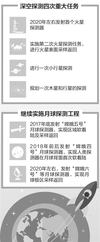 此外,我國(guó)還將繼續(xù)實(shí)施月球探測(cè)工程,突破探測(cè)器地外天體自動(dòng)采樣返回技術(shù)。將在2017年底發(fā)射“嫦娥五號(hào)”月球探測(cè)器,實(shí)現(xiàn)區(qū)域軟著陸及采樣返回,全面實(shí)現(xiàn)月球探測(cè)工程“三步走”戰(zhàn)略目標(biāo);2018年前后發(fā)射“嫦娥四號(hào)”月球探測(cè)器,實(shí)現(xiàn)人類(lèi)探測(cè)器在月球背面首次軟著陸,開(kāi)展原位和巡視探測(cè),以及地月L2點(diǎn)中繼通信;還將于2020年左右,發(fā)射“嫦娥六號(hào)”等月球探測(cè)器,實(shí)現(xiàn)月球極區(qū)采樣返回。