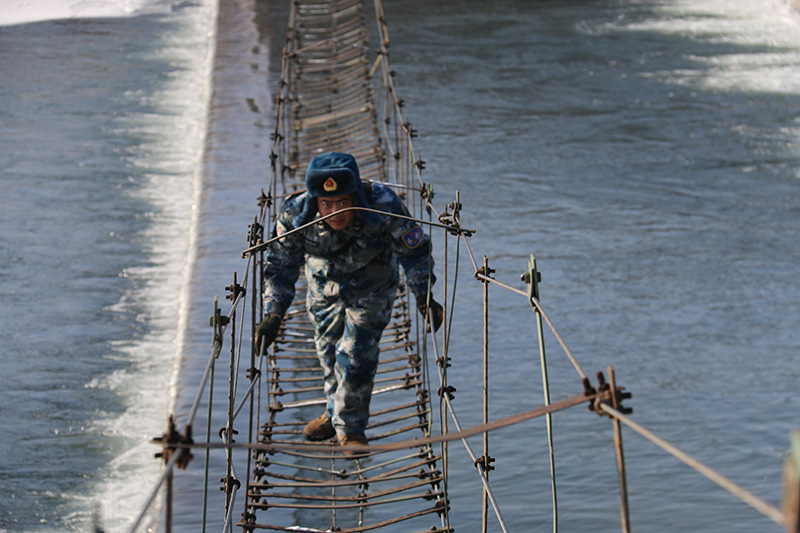 一條長約百米的簡易吊橋懸在大河上空,湍急的河水嘩嘩作響,積雪覆蓋在橋身,輕輕一步又晃又滑,加上六七米的高度,光是看一眼都能讓人心打怵腿發麻。這條鐵索橋是巡線路程的必經之處,也是場站通信兵的成長之橋。2005年劉少杰以優異的成績從空軍通信訓練基地畢業,憑借基地崗位練兵徒手攀登第一、綜合成績前五的實力回到連隊準備大展身手,結果第一天就遇上了“吊橋難”的問題。他在搖擺不定的吊橋前踟躕不前。面對險惡環境毫無“實戰”經驗的他一下子慌了神,所有專業技能都忘在了腦后。他的班長喊道:“穩住步子,不要看腳下,你能行。”班長的鼓勵沒能使他克服恐懼心理,第一次巡線就這樣不了了之。