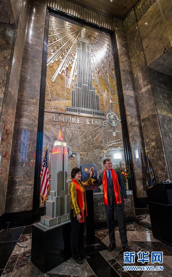 當日,中國駐紐約總領事章啟月、帝國大廈集團總裁兼首席運營官約翰·凱斯勒啟動帝國大廈“中國紅”點燈儀式。帝國大廈26日和27日兩天的燈光將為紐約的天際線增添中國節日的色彩。新華社記者李睿攝
