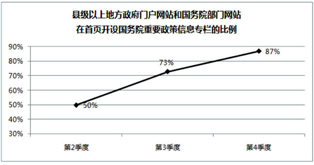 2016年第四季度全國政府網站重要政策信息聯動發布水平顯著提升。縣級以上地方政府門戶網站和國務院部門網站中,有87%在首頁顯著位置開設了國務院重要政策信息專欄,78%的網站能夠在國務院重要信息發布后24小時內進行轉載,比第三季度分別提高14和18個百分點。