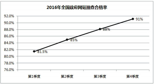 (一)網站合格率顯著上升。全國政府網站抽查合格率從第一季度的81.5%提升到第四季度的91%。河北、遼寧、安徽、山東、湖南、四川、陜西、甘肅、新疆、新疆生產建設兵團等地合格率上升顯著。北京、廣東、青海政府網站年內平均抽查合格率在95%以上,遼寧、上海、江蘇、浙江、安徽、海南和寧夏政府網站年內平均抽查合格率在90%以上。