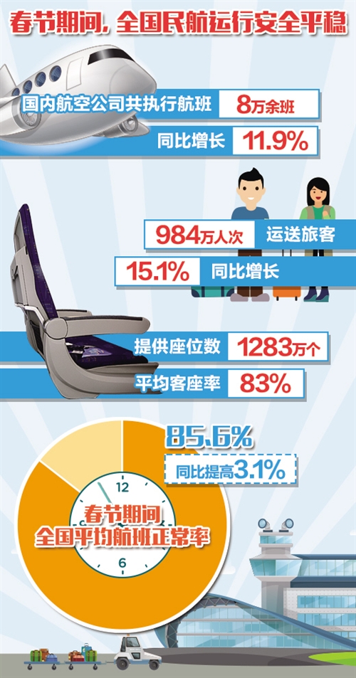 截至2月6日,春運期間我國民航運行安全平穩。值得一提的是,航班正常率有所上升,今年春節黃金周期間全國平均航班正常率85.6%,同比提高3.1%。