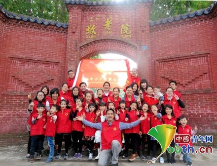 劉天明帶領小欖中小學學生給敬老院老人們喂飯、敬老。本人供圖