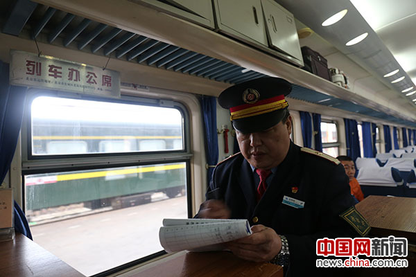 2月14日,K51/52次列車長朱運(yùn)濤在列車辦公席查閱工作記錄。中國網(wǎng)記者 郭澤涵 攝