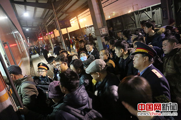 2月14日,列車長朱運(yùn)濤在上下乘客較多的臨沂車站觀察。中國網(wǎng)記者 郭澤涵 攝