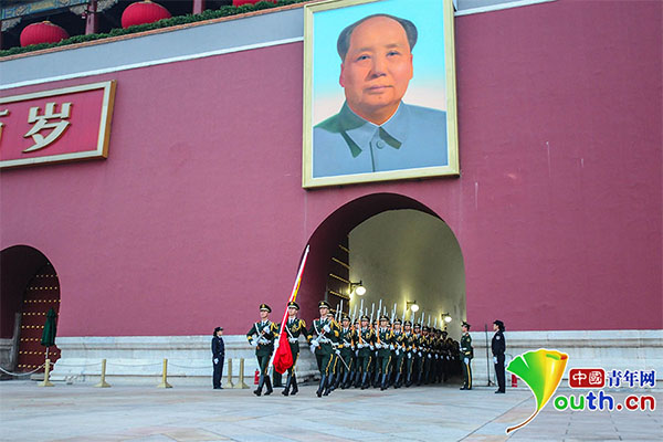 國旗護衛戰士保衛著國旗走出天安門。中國青年網記者 李拓 攝
