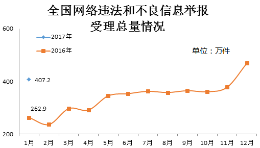2017年1月,全國各地網信辦、各網站積極采取有力措施,進一步強化網絡舉報工作,受理違法和不良信息舉報共407.2萬件,同比增長約54.9%。經審核,有效舉報271.5萬件。