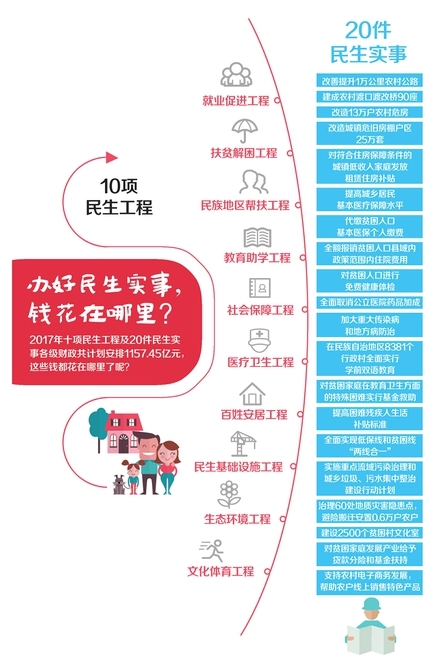 和過(guò)去一樣,民生工程的開(kāi)展圍繞人們醫(yī)食住行學(xué)娛等分成十大類,包括就業(yè)促進(jìn)、扶貧解困、民族地區(qū)幫扶、教育助學(xué)、社會(huì)保障、醫(yī)療衛(wèi)生、百姓安居、民生基礎(chǔ)設(shè)施、生態(tài)環(huán)境和文化體育等工程。