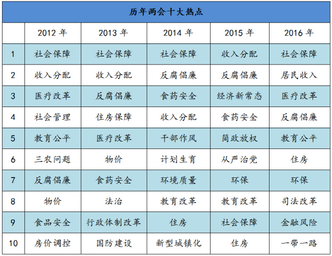 縱觀近五年來的兩會話題關(guān)注度,百姓對涉及政治、經(jīng)濟、文化、社會等領(lǐng)域的傳統(tǒng)熱點新聞信息較為關(guān)注,其中社會保障、收入分配、反腐倡廉等是歷年來受到百姓持續(xù)關(guān)注的熱點話題。其次,由于近年來,我國在諸多領(lǐng)域都進行了較大程度的改革,因此對于新制度、新改革的成績及進一步的改革措施也成為百姓較為關(guān)注的熱點話題。歷年兩會熱點排行如下: