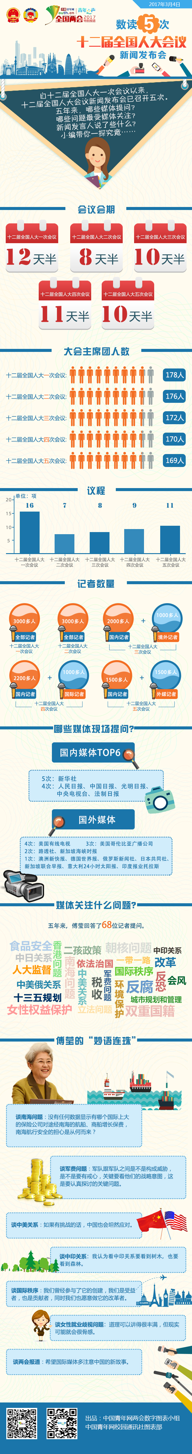 中國青年網北京3月4日電自十二屆全國人大一次會議以來,十二屆全國人大會議新聞發布會已召開五次。五年來,哪些媒體提問?哪些問題最受媒體關注?新聞發言人說了些什么?小編帶你一探究竟……