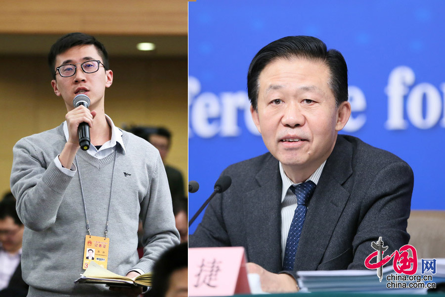 中國網(wǎng)記者向財政部部長肖捷提問。中國網(wǎng) 高聰攝影