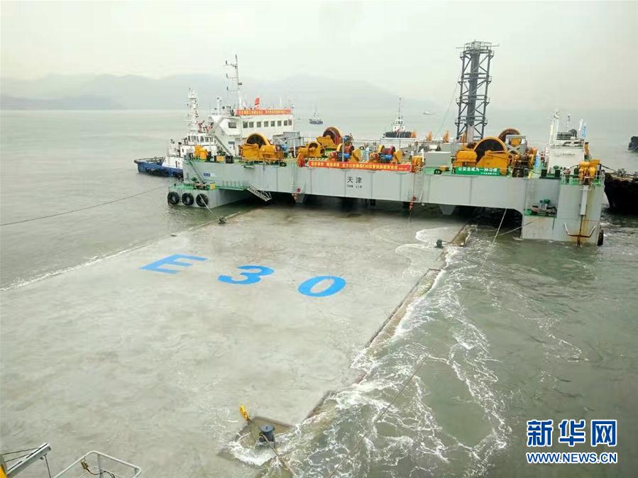 施工方將最后一節沉管運至指定區域(3月6日攝)。3月7日,港珠澳大橋海底隧道最后一節巨型沉管——E30管節安裝成功,軸線、縱坡、艏艉高差等各項關鍵指標均滿足設計標準。至此,體量超大的33節沉管全部安裝完畢,港珠澳大橋已建隧道總長5652米,距最終合龍僅差12米。新華社記者周強攝