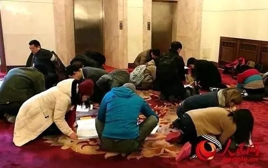 采訪完嘉賓,記者們趴在大廳里發稿,搶速度、拼深度、比角度。