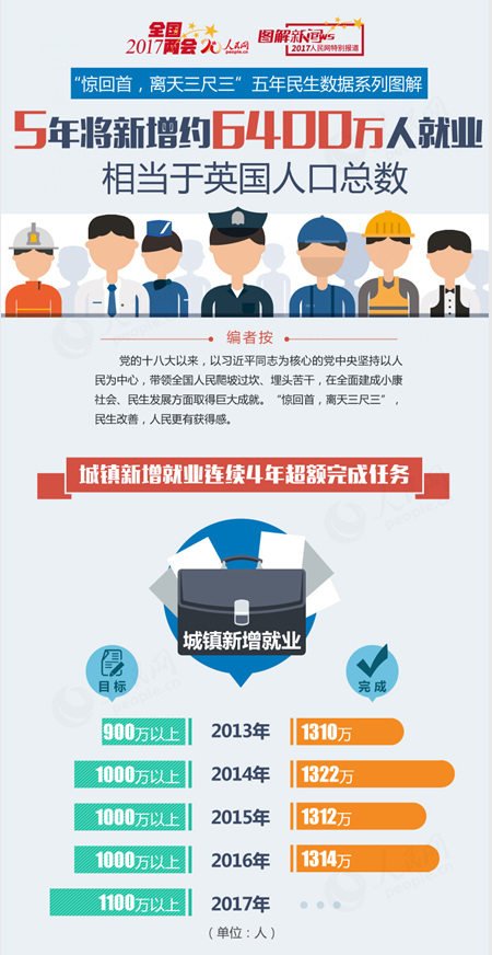 對(duì)于2017年發(fā)展的主要預(yù)期目標(biāo),《政府工作報(bào)告》提出:“城鎮(zhèn)新增就業(yè)1100萬(wàn)人以上,城鎮(zhèn)登記失業(yè)率4.5%以內(nèi)。”今年城鎮(zhèn)新增就業(yè)預(yù)期目標(biāo)比去年多100萬(wàn)人,突出了更加重視就業(yè)的導(dǎo)向。據(jù)估算,中國(guó)5年來(lái)新增約6400萬(wàn)就業(yè)人口,相當(dāng)于英國(guó)全國(guó)的人口數(shù)。