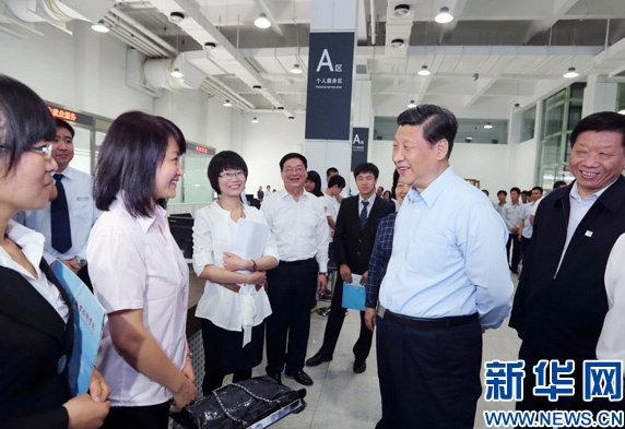 2013年5月14日至15日,中共中央總書記、國(guó)家主席、中央軍委主席習(xí)近平在天津考察工作。這是習(xí)近平在天津人力資源發(fā)展促進(jìn)中心與應(yīng)聘人員親切交談。新華社記者蘭紅光攝