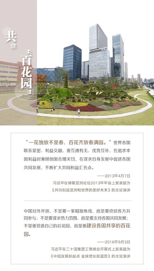 2016年G20杭州峰會上,習(xí)近平說,中國對外開放“不是要營造自己的后花園,而是要建設(shè)各國共享的百花園”。
