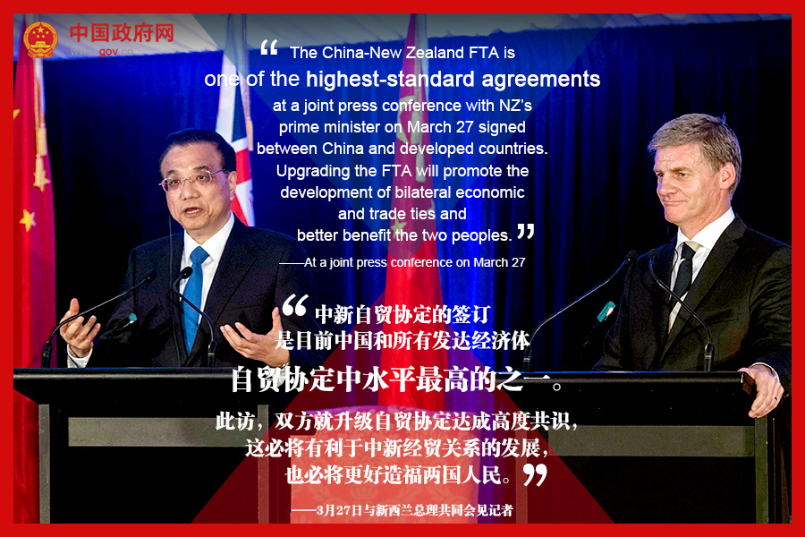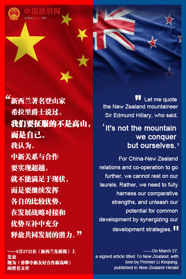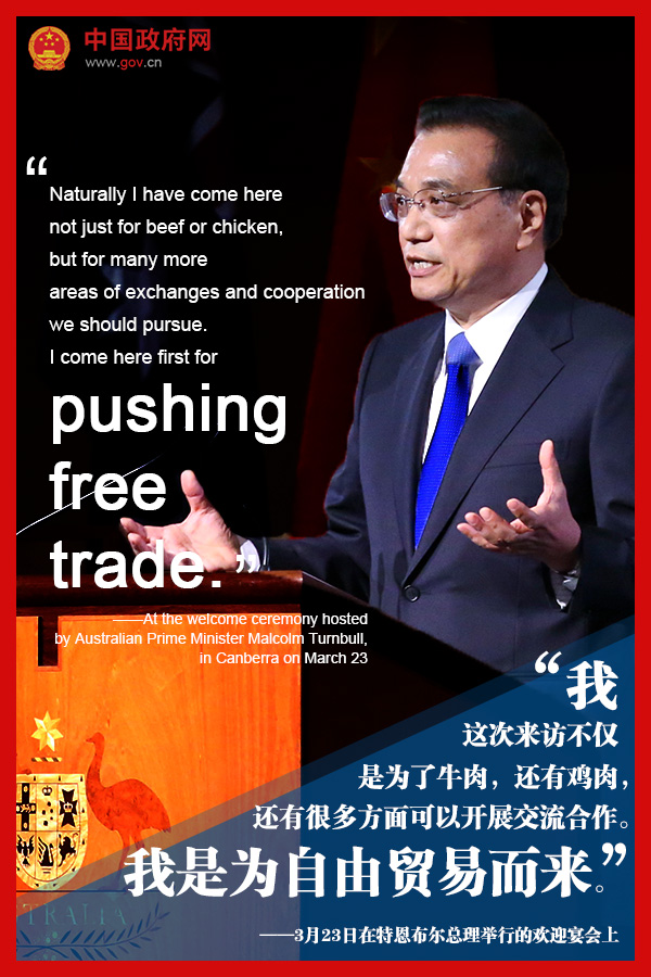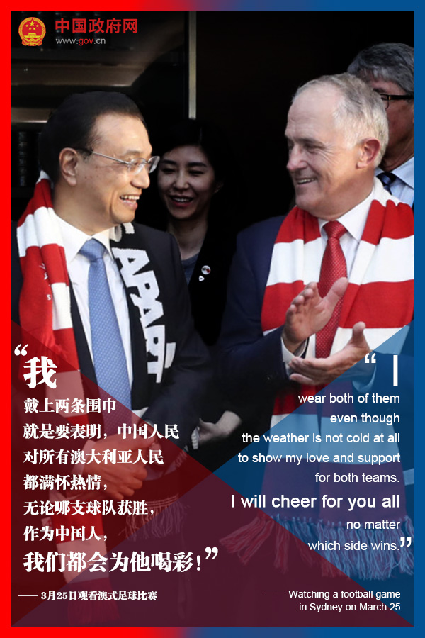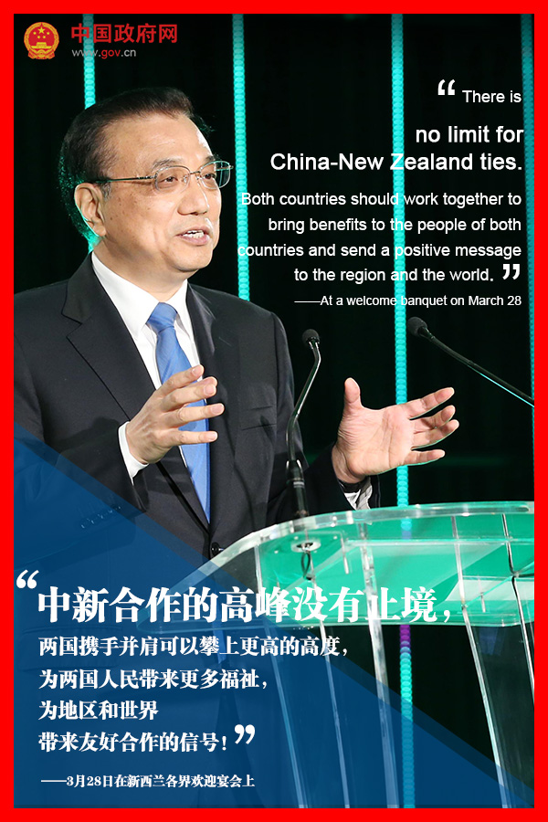 國務院總理李克強于3月22日至29日對澳大利亞和新西蘭進行正式訪問,這也是11年來中國總理對這兩個國家的首次訪問。海外關注李克強總理的哪些話?中國政府網用8張海報帶你一起來看看,雙語啊!