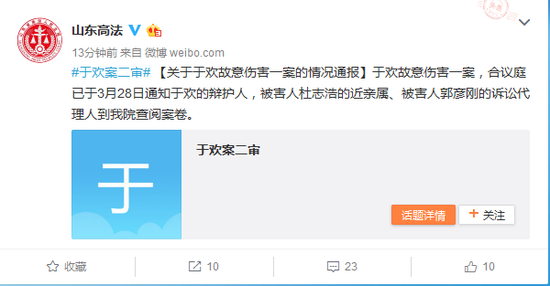 #于歡案二審# [關(guān)于于歡故意傷害一案的情況通報]于歡故意傷害一案,合議庭已于3月28日通知于歡的辯護人,被害人杜志浩的近親屬、被害人郭彥剛的訴訟代理人到我院查閱案卷。