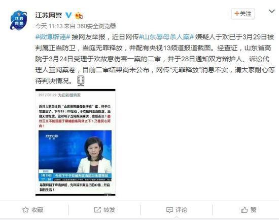 #微博辟謠# 接網(wǎng)友舉報,近日網(wǎng)傳山東辱母殺人案嫌疑人于歡已于3月29日被判屬正當(dāng)防衛(wèi),當(dāng)庭無罪釋放,并配有央視13頻道報道截圖。經(jīng)查證,山東省高院于3月24日受理于歡故意傷害一案的二審,并于28日通知雙方辯護人、訴訟代理人查閱案卷,目前二審結(jié)果尚未公布,網(wǎng)傳“無罪釋放”消息不實,請大家耐心等待判決情況。