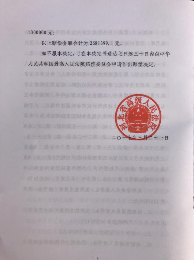 記者今天從河北高院獲悉,3月28日,河北高院已向聶樹斌父母送達了國家賠償決定書,據河北高院介紹,在這起國家賠償案辦理過程中,河北高院依據相關法律與賠償申請人進行了充分協商,雙方就賠償項目和賠償數額達成了協議,賠償決定的具體數額如下: