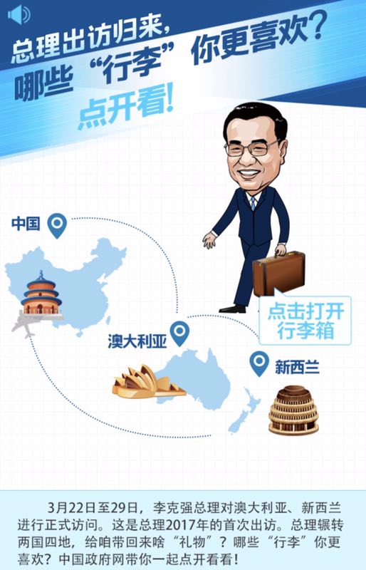 3月22日至29日,李克強總理對澳大利亞、新西蘭進行正式訪問。這是總理2017年的首次出訪。總理輾轉兩國四地,給咱帶來啥“禮物”?哪些“行李”你更喜歡?中國政府網帶你一起點開看看!