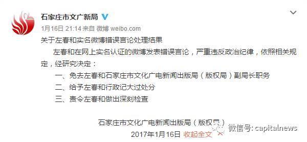 今年1月,左春和被免去石家莊文化廣電新聞出版局副局長(zhǎng)的職務(wù),原因是在微博發(fā)表錯(cuò)誤言論,嚴(yán)重違反政治紀(jì)律。