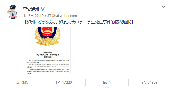 未來網記者注意到,這是4月1日瀘縣太伏中學學生死亡案后,瀘州市公安局首次公開回應。