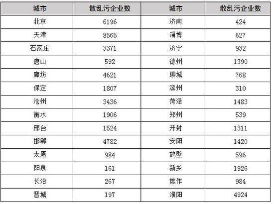 四是各城市排查數量差異較大。“2+26”個城市共報送“散亂污”企業數5.6萬余家。北京市6196家,天津市8565家,河北省22039家(廊坊市4621家、唐山市592家),山西省1609家(太原市984家、陽泉市161家),山東省5934家(菏澤市1483家、濱州市310家),河南省11700家(濮陽市4924家、鄭州市539家)。