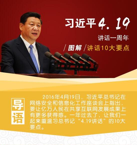 2016年4月19日,習近平總書記在網絡安全和信息化工作座談會上指出,要讓億萬人民在共享互聯網發展成果上有更多獲得感。一年過去了,讓我們一起來重溫習總書記“4.19講話”的10大要點。