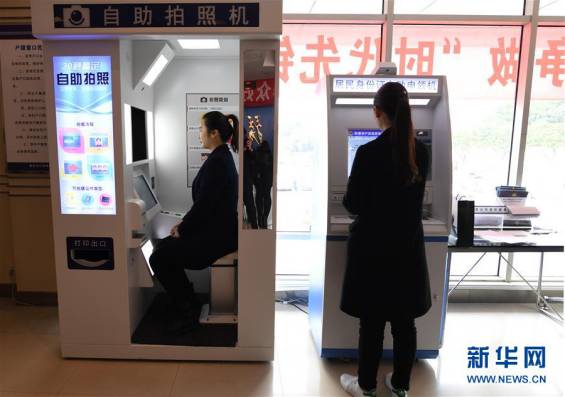 2017年3月8日,市民在重慶兩江新區(qū)人和派出所使用身份證自助拍照機(jī)和自助申領(lǐng)機(jī)。 重慶市兩江新區(qū)公安分局推出的這項(xiàng)“互聯(lián)網(wǎng)+”便民措施可全天候24小時(shí)辦理身份證到期換領(lǐng)、丟失補(bǔ)領(lǐng)等業(yè)務(wù),全程僅需約3分鐘。新華社記者王全超攝
