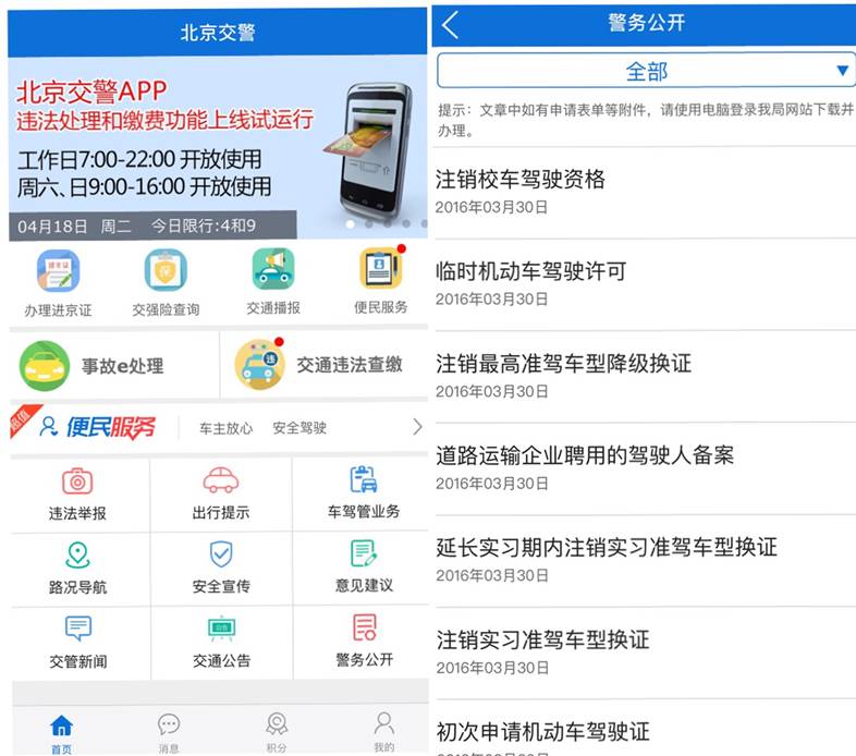 這是北京公安局推出的“北京交警”APP截圖,用戶(hù)可在首頁(yè)方便查詢(xún)業(yè)務(wù)辦理情況以及警務(wù)公開(kāi)信息。