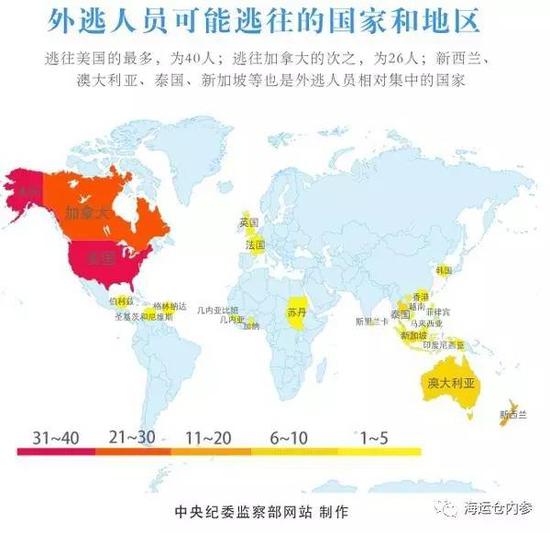“海運倉內(nèi)參”(ID:hycplb)注意到,在貪官外逃的國家和地區(qū)里,西方發(fā)達國家是首選,在中紀委發(fā)布的這張地圖里也可清晰看出。美國、加拿大和澳大利亞,是外逃貪官的“首選”。