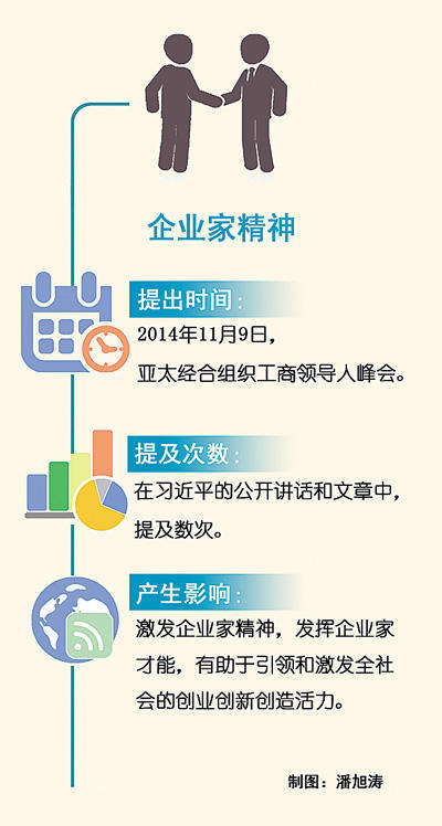 “我們?nèi)嫔罨母铮鸵ぐl(fā)市場蘊(yùn)藏的活力。市場活力來自于人,特別是來自于企業(yè)家,來自于企業(yè)家精神。”2014年11月9日,在亞太經(jīng)合組織工商領(lǐng)導(dǎo)人峰會上,面對來自數(shù)十個(gè)國家和地區(qū)的1500多位工商界代表,國家主席習(xí)近平特別提及了企業(yè)家精神。
