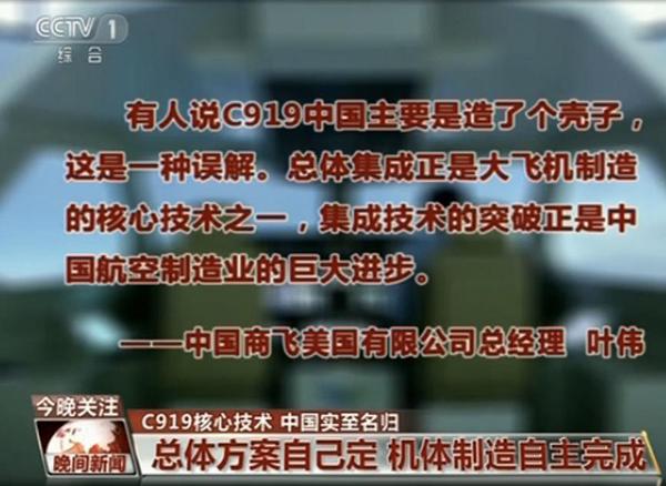 中國商飛美國有限公司總經理葉偉在接受新華社采訪時表示,有人說C919中國主要是造了個殼子,這是一種誤解。總體集成正是大飛機制造的核心技術之一,集成技術的突破正是中國航空制造業的巨大進步。