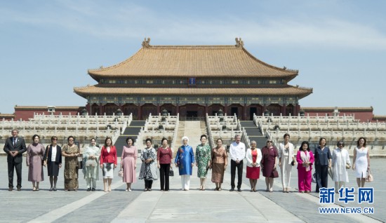 國(guó)家主席習(xí)近平夫人彭麗媛15日邀請(qǐng)出席“一帶一路”國(guó)際合作高峰論壇的外方團(tuán)長(zhǎng)配偶參觀世界文化遺產(chǎn)——故宮博物院。阿根廷總統(tǒng)夫人阿瓦達(dá)、捷克總統(tǒng)夫人澤曼諾娃、印度尼西亞總統(tǒng)夫人伊莉亞娜、肯尼亞總統(tǒng)夫人瑪格麗特、老撾國(guó)家主席夫人坎蒙、瑞士聯(lián)邦主席丈夫豪森、土耳其總統(tǒng)夫人埃米奈、烏茲別克斯坦總統(tǒng)夫人米爾濟(jì)約耶娃、越南國(guó)家主席夫人阮氏賢、菲律賓總統(tǒng)女友艾凡希娜、斐濟(jì)總理夫人瑪麗亞、匈牙利總理夫人雷沃伊、意大利總理夫人毛羅、馬來(lái)西亞總理夫人羅斯瑪、蒙古國(guó)總理夫人通格勒格、巴基斯坦總理夫人卡爾蘇姆、斯里蘭卡總理夫人麥特麗、希臘總理女友巴齊亞娜、國(guó)際貨幣基金組織總裁丈夫吉奧坎蒂等參加。
