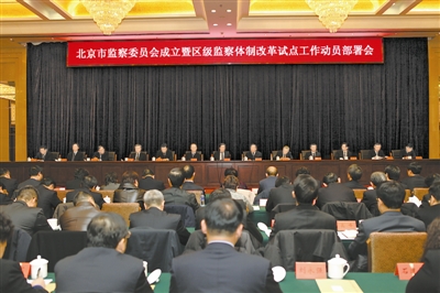 “要堅持市、區聯動推進,嚴格按照改革時間表和路線圖完成全市改革試點任務。要加強探索創新,及時完善配套規定,推進工作流程磨合,構建集中統一、權威高效的監察體系!1月21日召開的北京市監察委員會成立暨區級監察體制改革試點工作動員部署會上,市委對區級改革試點工作作出部署。