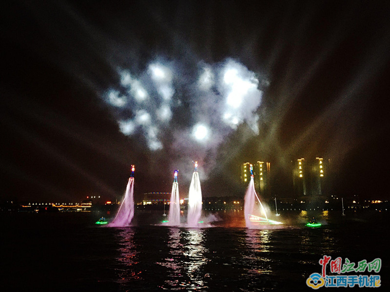 夜色中的西海灣親水平臺,游人如織,一場精彩酷炫的水上演出拉開序幕。在飛速行駛的拖船牽引下,幾名姑娘在水面翩翩起舞,就像踏浪而來的凌波仙子。精彩酷炫的水上摩托和驚險(xiǎn)刺激的水上飛人表演,讓采訪團(tuán)朋友們嘆為觀止,報(bào)以陣陣熱烈掌聲。來自北京的媒體朋友連連贊嘆:“此番夜游武寧西海灣真是不虛此行!”江西手機(jī)報(bào)訊記者李志強(qiáng)