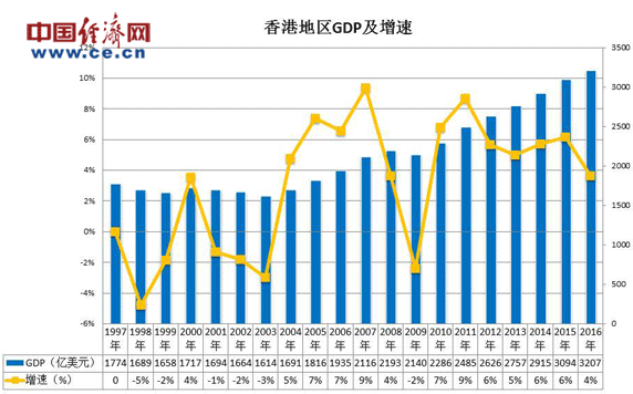 圖表:香港回歸20年GDP情況(數(shù)據(jù)來(lái)源:香港特區(qū)政府統(tǒng)計(jì)處)中國(guó)經(jīng)濟(jì)網(wǎng)石璐言制作