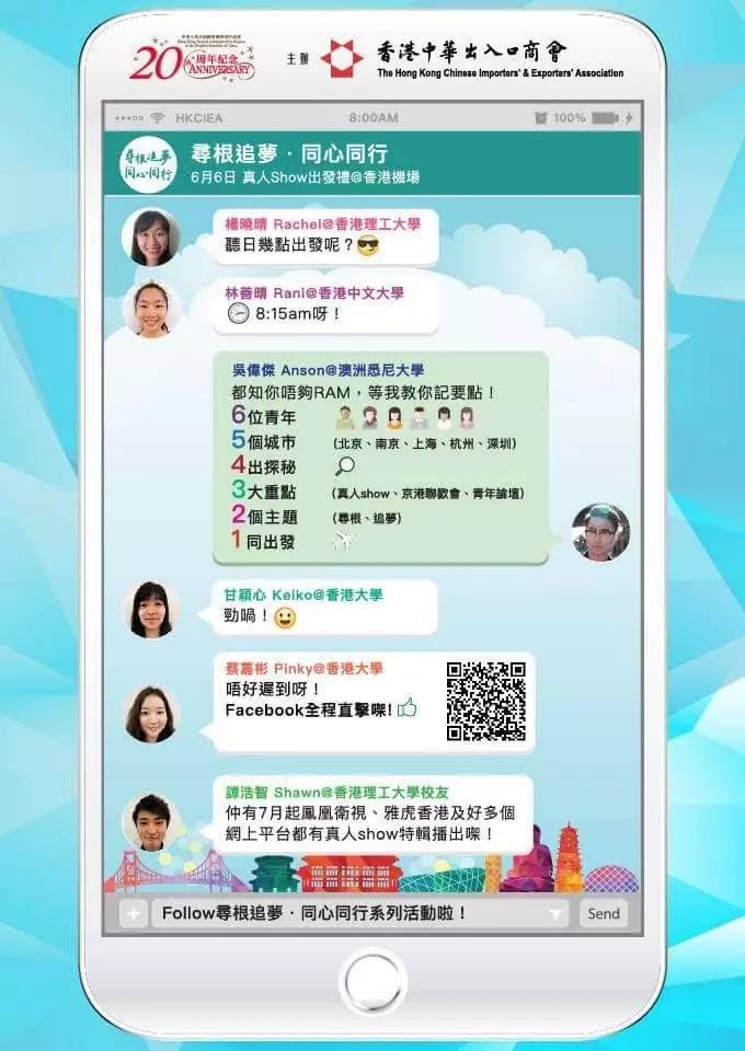 “尋根追夢 同心同行”活動挑選了6位來自各大院校及界別的年輕人一同到內地進行交流。參與活動的6位青年分別是來自香港大學的甘穎心(Keiko)、蔡嘉彬(Pinky),香港理工大學的楊曉晴(Rachel)及校友譚浩智(Shawn),香港中文大學的林善晴 (Rani),以及澳洲悉尼大學的吳偉杰 (Anson)。
