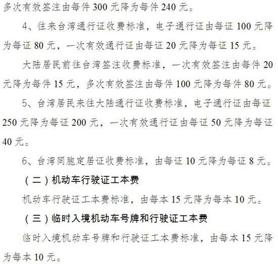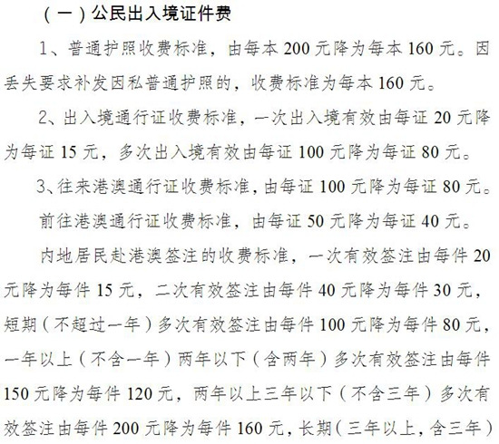 其中,多項出入境證件費下調。如,普通護照標準由每本200元降至160元,一次出入境有效由每證20元降為15元,港澳通行證由每證100元降至80元。