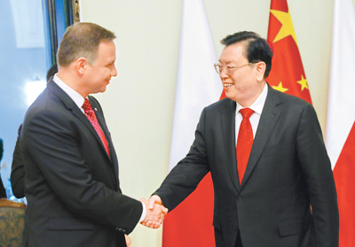 會見杜達總統(tǒng)時,張德江轉(zhuǎn)達了習(xí)近平主席的親切問候。他說,中波兩國人民之間有著深厚的友好感情。過去兩年,習(xí)近平主席同總統(tǒng)閣下實現(xiàn)互訪,兩國建立全面戰(zhàn)略伙伴關(guān)系,中波關(guān)系開啟了新的篇章。中方高度重視發(fā)展與波蘭的關(guān)系,視波蘭為中國與中東歐和歐盟合作的重要伙伴。雙方應(yīng)鞏固政治互信,傳承傳統(tǒng)友誼,抓住“一帶一路”建設(shè)和“16+1合作”帶來的新機遇,深化經(jīng)貿(mào)、投資、地方等領(lǐng)域互利合作,推動中波關(guān)系不斷深入發(fā)展。杜達請張德江轉(zhuǎn)達對習(xí)近平主席的良好祝愿。他表示,波蘭欽佩中國的發(fā)展成就,期待通過“一帶一路”建設(shè)深化對華友好合作,加強在國際問題上的溝通協(xié)調(diào),維護共同利益,不斷豐富、發(fā)展兩國全面戰(zhàn)略伙伴關(guān)系。