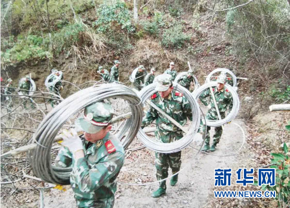 2008年2月,受冰凍災害影響,和平縣電網遭不同程度損壞,為加快搶修電路,和平中隊官兵用自己雙手將近10噸重的導線抬到近千米高的上陵羊角石峰地段。新華網發(和平中隊供圖)